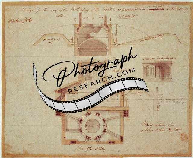 Inscriptions on recto: '[...] Plan of the Framing of the Roof of the Hall of Rep. Washn.' 'Cieling [sic] of the Hall of Representatives, Capitol Washington BHLatrobe, Furv. PB.' 'Novr. 28th United States Washn. 1805'
