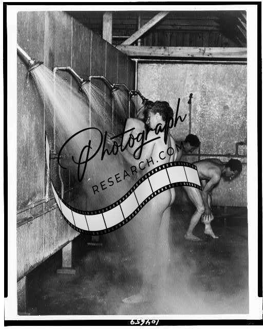 US Civilian Conservation Corps enrollees showering,facilities,bathing,men,1935