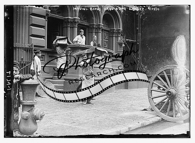 Moving books, Astor Library,New York,fire hydrant,men carrying boxes,April 1911
