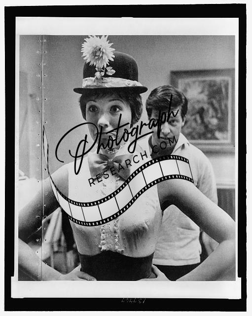 Julie Andrews making a face while wearing a derby hat with flower while husband Tony Walton watches in the background