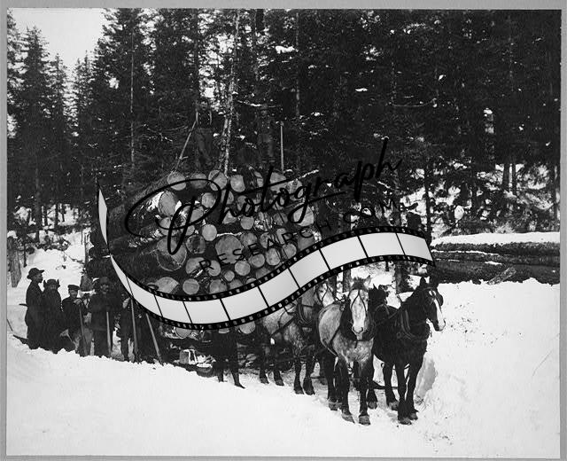 Logs being hauled on sleigh,team of horses,Seward,Alaska,AK,1900-1930,Lumber
