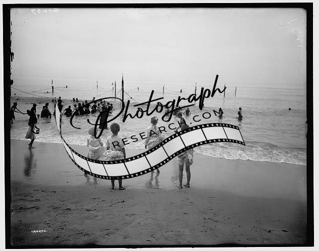 Beach,children playing outdoors,water,swimmers,Detroit Publishing Company,1900