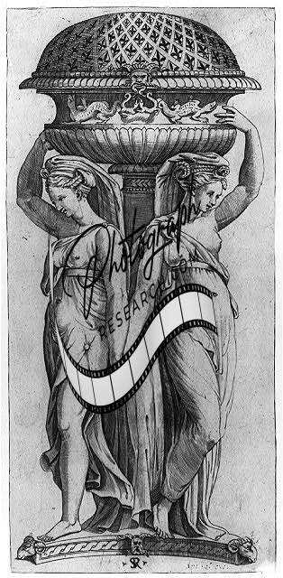 Two caryatids carrying an incense burner,Marcantonio Raimondi,Raphael