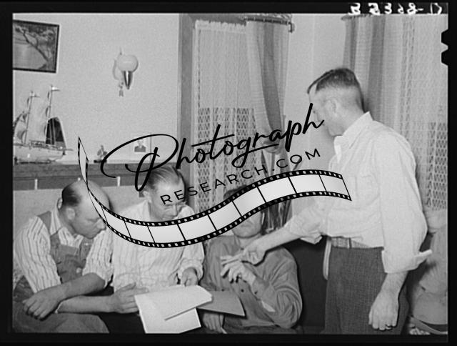 Title: Voting for caretaker of stallion at meeting of farmers who belong to FSA (Farm Security Administration) cooperative stallion organization. Box Elder County, Utah