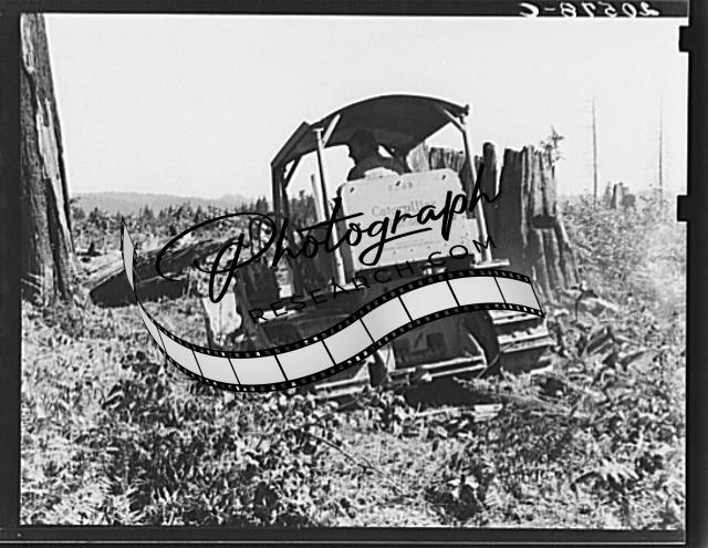 Title: Bulldozer equipped with grader blade pushing over a stump. Western Washington, Lewis County, near Vader, Washington. See general caption number 46