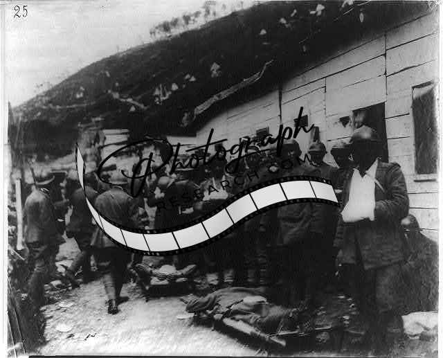 Dressing station,Italian soldiers,building,wounded,litters,casualties,Italy,1916