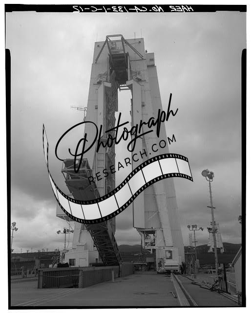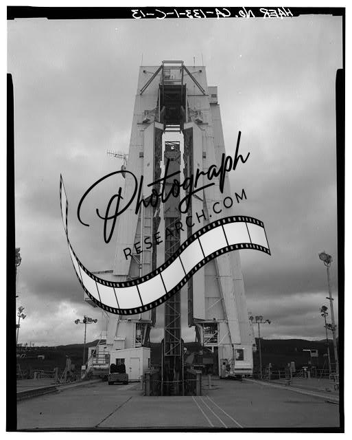 Title: 15. VIEW OF NORTH FACE AND EAST SIDE OF MST IN PARKED POSITION, NORTH OF THE FULLY ERECTED UMBILICAL MAST. SLC-3E MST IN PARKED POSITION IN BACKGROUND (LEFT). - Vandenberg Air Force Base, Space Launch Complex 3, Launch Pad 3 West, Napa & Alden Roads, Lompoc, Santa Barbara County, CA