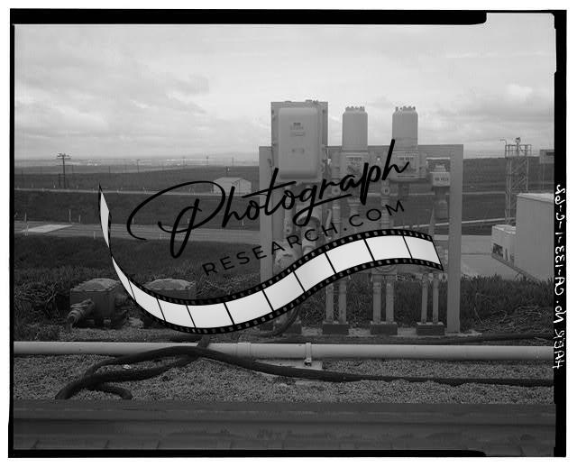 Title: 59. GENERAL VIEW OF ATLAS E/F LAUNCHER AT SLC-3W FROM ITS SOUTHWEST CORNER. SOUTH FACE OF ERECT UMBILICAL MAST IN BACKGROUND. - Vandenberg Air Force Base, Space Launch Complex 3, Launch Pad 3 West, Napa & Alden Roads, Lompoc, Santa Barbara County, CA