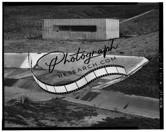 Title: 63. GENERAL VIEW OF SOUTH FACE OF SLC-3W MST AND LAUNCH DECK SHOWING FLAME BUCKET AND DELUGE CHANNEL. RETENTION BASIN IN FOREGROUND. - Vandenberg Air Force Base, Space Launch Complex 3, Launch Pad 3 West, Napa & Alden Roads, Lompoc, Santa Barbara County, CA