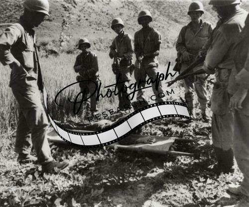 US Marines cover wounded North Korean soldiers,stretcher,Naktong River,Korea