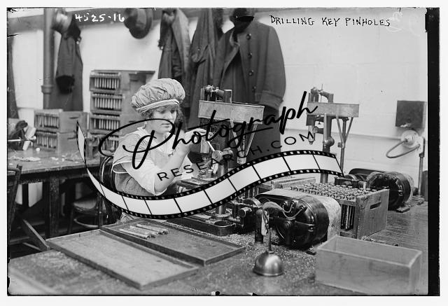 Drilling key pinholes,woman working,machinery,Bain News Service