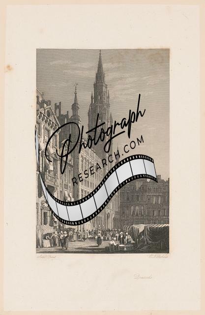 Brussels, Print shows a street scene with pedestrians along the front of the Brussels town hall (Hôtel de Ville).