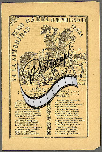 Summary: Broadside includes portrait of military leader Macario Romero on horseback and Indians wearing feathered headdresses in the background. The text tells of the murder of Romero by his girlfriend's father and speaks about his valor. Romero fought against the government of President Sebastián Lerdo de Tejada and served in the state of Morelos until he was killed in 1878 or 1879. The song 'Corrido de zenzontle' and an image of a rose appear on the verso.