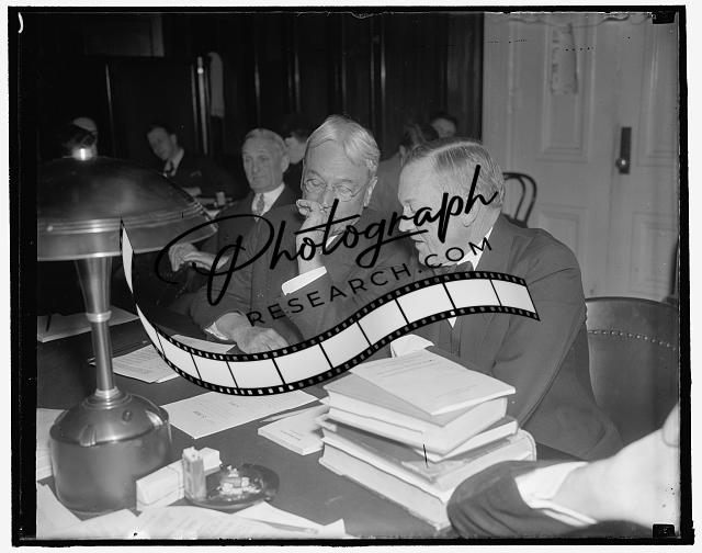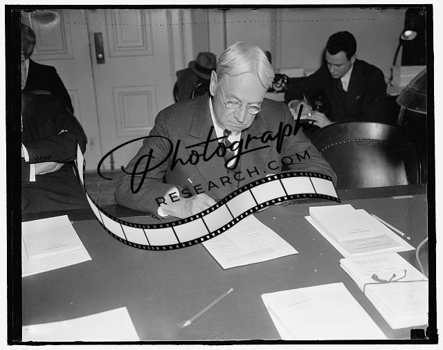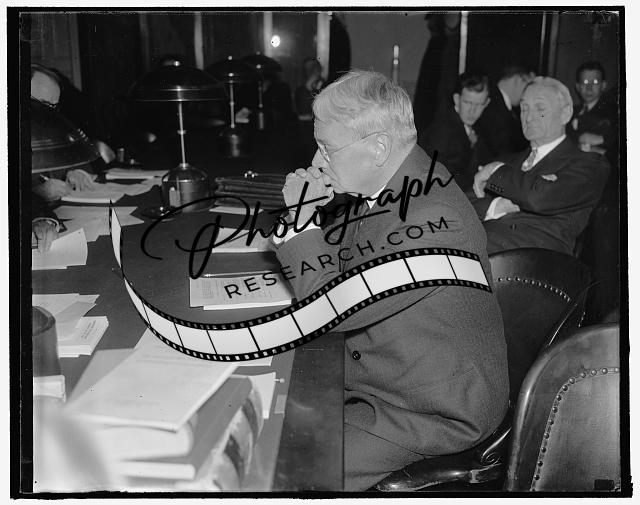 Title: California's veteran republican senator. Washington, D.C., Jan. 19. Senator Hiram W. Johnson, veteran republican legislator from California, pictured in a series of poses while he listened to testimony before the Senate Commerce Committee now investigating the country's maritime industry. Senator Johnson is a member of the committee, 1/19/38