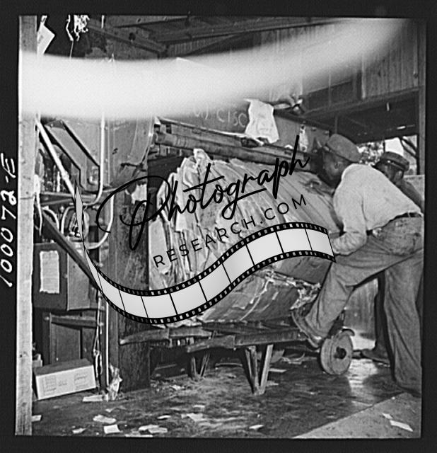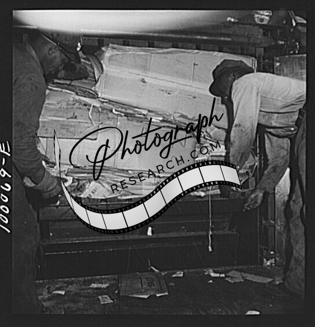 Title: Washington, D.C. Salvage drive, Victory Program. Bales of pressed scrap paper being unloaded from hydraulic press in District retail paper company