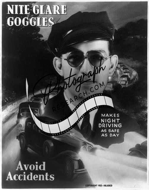 Nite-Glare Goggles,c1933,Advertisement,man wearing goggles,cars on road,night