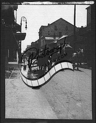 View down street,buildings,carts,New Orleans,Louisiana,LA,Arnold Genthe,1920