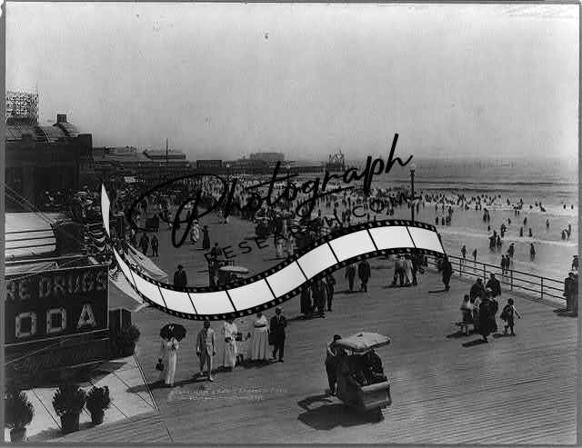Boardwalk,bathers,Atlantic City,New Jersey,NJ,c1915,carts?,people,storefronts