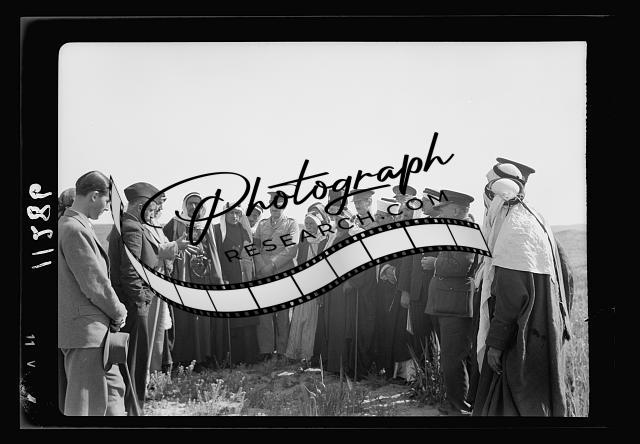 Title: Visit to Beersheba Agricultural Station (Experimental) by Brig. Gen. Allen & staff & talks to Bedouin sheiks of district by station superintendent. Mixed group in field of grain listening to lecture