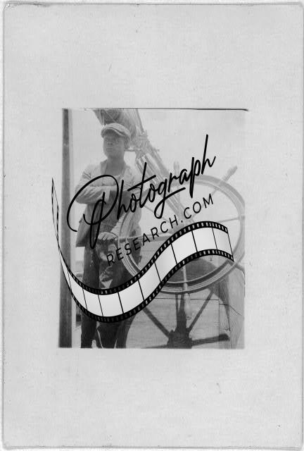 Man standing at wheel of ship, facing forward, taken during Bahamas recording expedition
