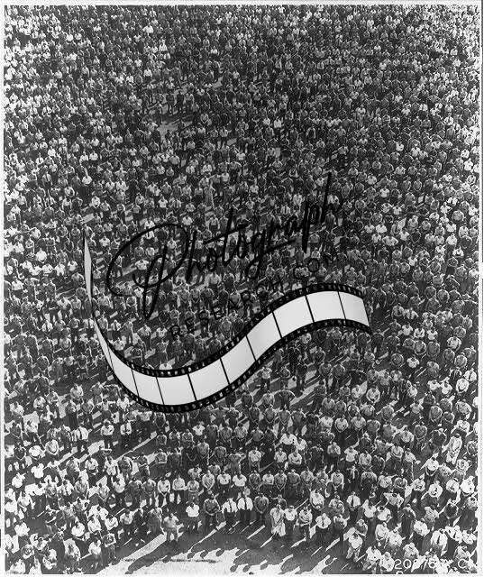 Large crowd of aircraft workers listening to Army Air Force production pep talk