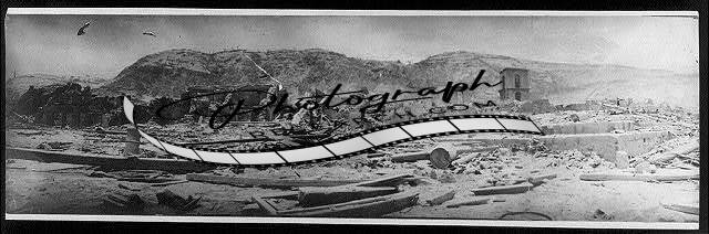 Title: [News photos after volcanic eruption of Mont Pelée, Martinique, 1902]: panorama of devastation in St.-Pierre - looking down shoreline
