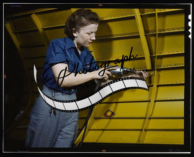Title: Drilling horizontal stabilizers: operating a hand drill, this woman worker at Vultee-Nashville is shown working on the horizontal stabilizer for a Vultee 'Vengeance' dive bomber, Tennessee. The 'Vengeance' (A-31) was originally designed for the French. It was later adopted by the R.A.F. and still later by the U.S. Army Air Forces. It is a single-engine, low-wing plane, carrying a crew of two men and having six machine guns of varying calibers