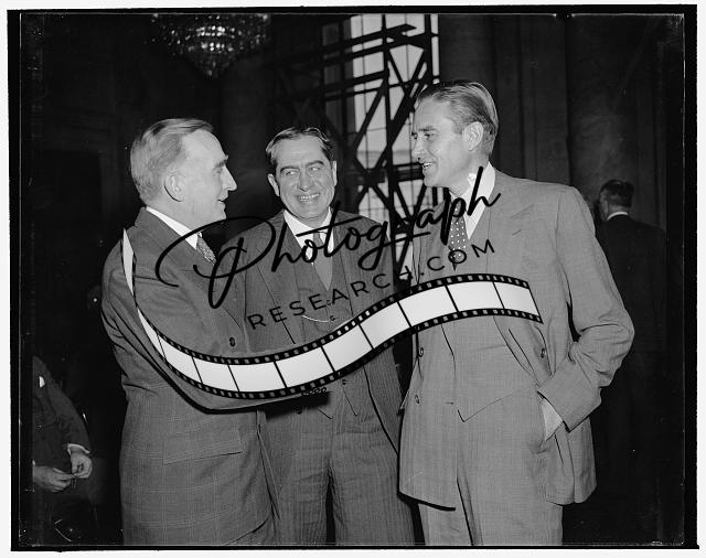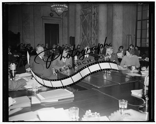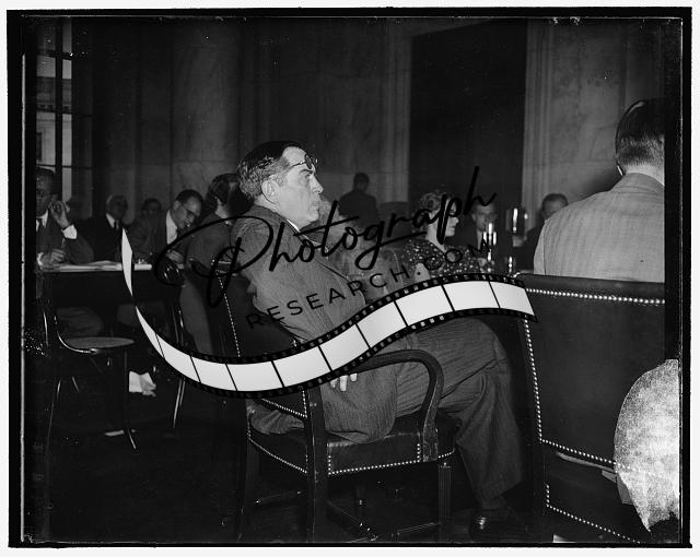 Title: Harriman, Ripley, & Co. owner holds firm never violated banking laws. Washington, D.C., Dec. 12. Testifying before the Monopoly Committee this morning, W. Averill Harriman, Wall Street Financier, asserted and was corroborated by his partner, J.P. Ripley, that the firm of Harriman, Ripley, & Co. set up in 1934, was not established to side-step the Banking Act of 1933. The act divorced securities business from commerical banking in banking houses. He asserts that the firm was set up to provide for the future of those employees of the National City Co. whose investment and underwriting activities were ended by the Act of 1933. Photo shows Harriman as he was testifying this morning