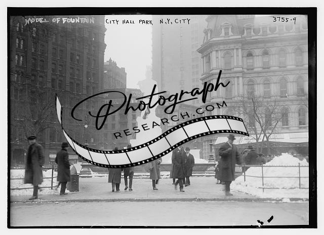 Model of Fountain,City Hall Park,N.Y.C.,New York City,people,snow,Buildings,Bain