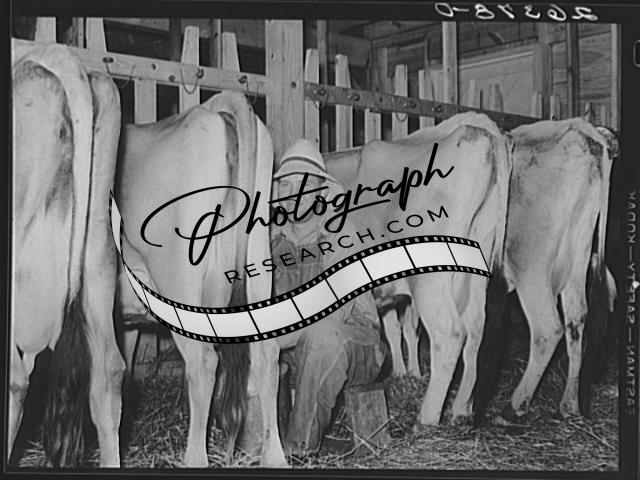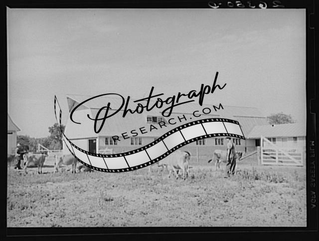 Title: Cows and calves in the project dairy barn. Wabash Farms, Indiana