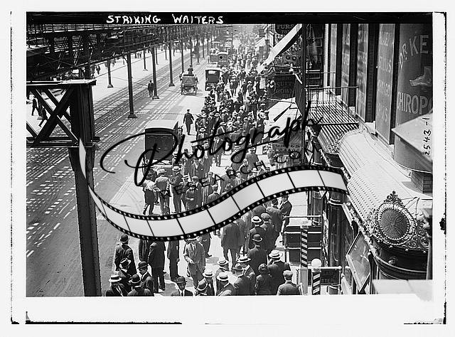 Waiter strikers,1912,crowded sidewalk,storefronts,horse drawn carriages