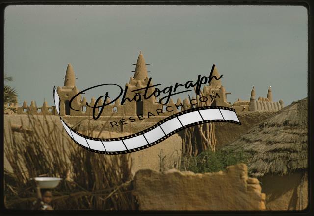 Minarets and upper walls of a mud mosque in Mali; foreground shows adobe walls, firewood(?),and a thatched roof building on right