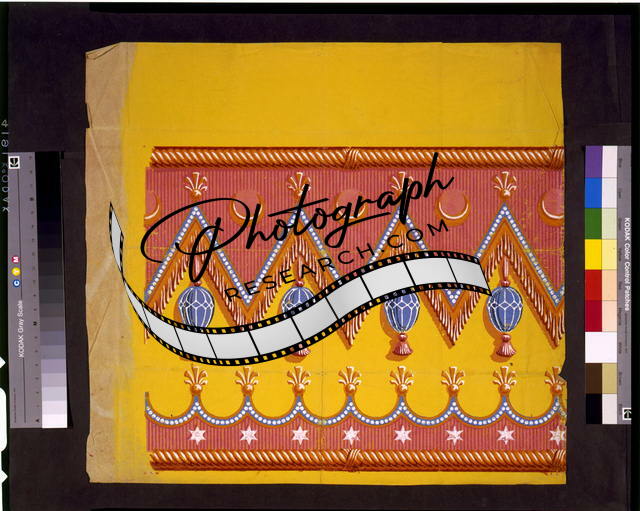 Title: [Wallpaper design number fifty three, by Messrs. Virchaux & Co. Border for number fifty two. A drapery supported by a crescent, the sides folding around a rosette, a garland of vine leaves thrown over the drapery]
