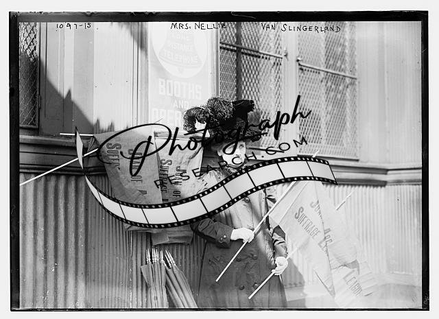 Mrs. Nellie van Slingerland holding banner of Joan of Arc Suffrage League
