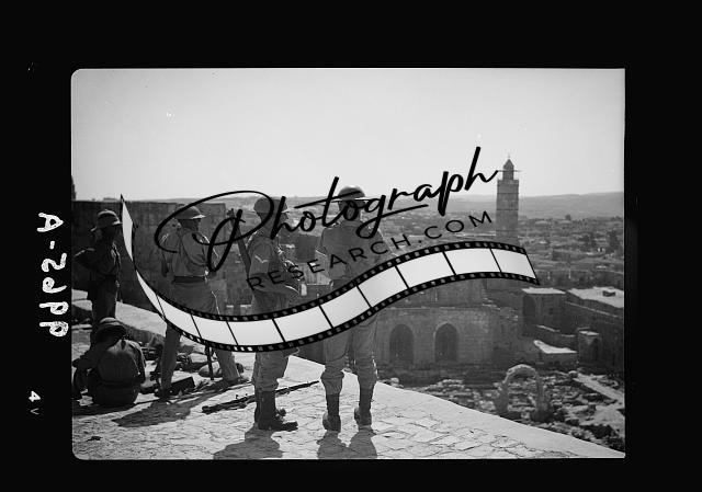 Title: War-like scene on roof of Tower of David, mounted machine guns - tele.