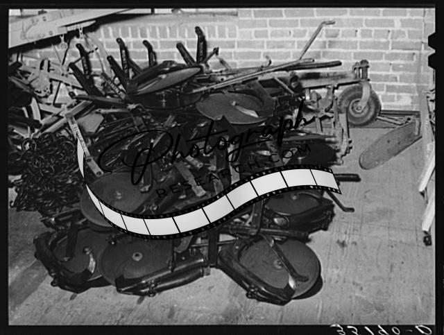 Title: Tractors at farm equipment warehouse. Oklahoma City, Oklahoma