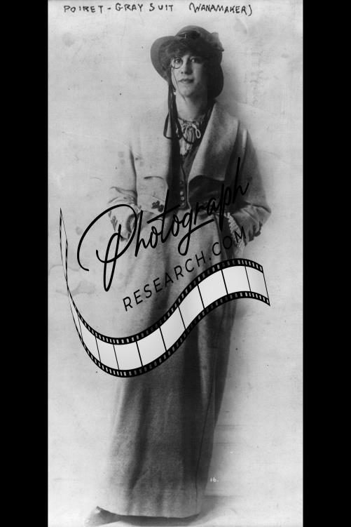 Woman in Poiret,Gray Suit Wanamaker,standing,wearing monocle,April 1914,fashion