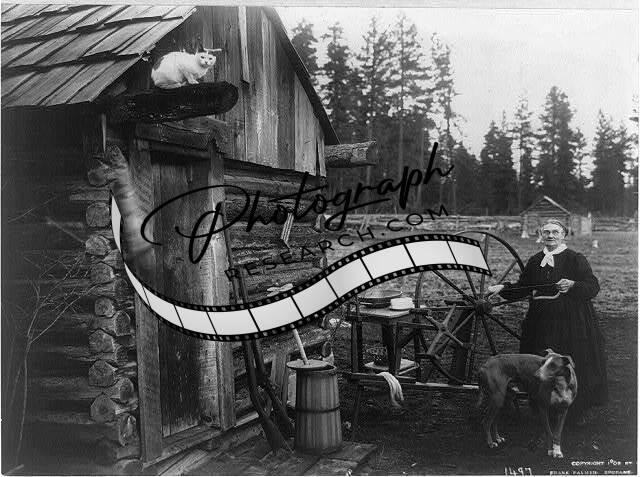 Old Way,Woman,Spinning Wheel,Log Cabin,Dog,Cat,Butter Churn,c1908,Washington,WA