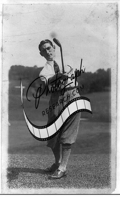 Tom Amour following through on golf swing,June 18,1927,golf club,wearing tie