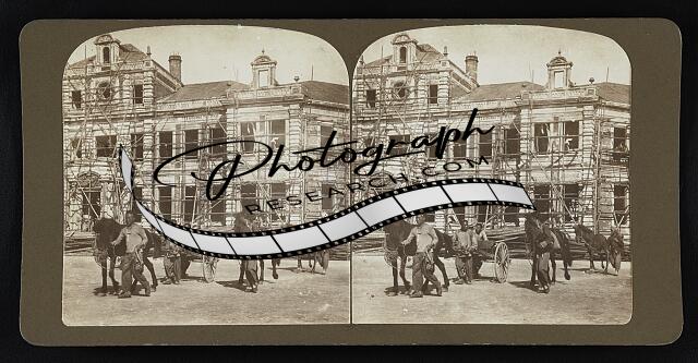 [[Men walking with horses in front of building with scaffolding]]