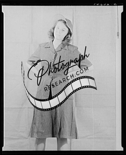 Title: Washington, D.C. Modeling denim dress and hat worked out for a high school girl on a low income by graduate students of the Deptartment of Clothing and Textiles, School of Home Economics, University of Alabama
