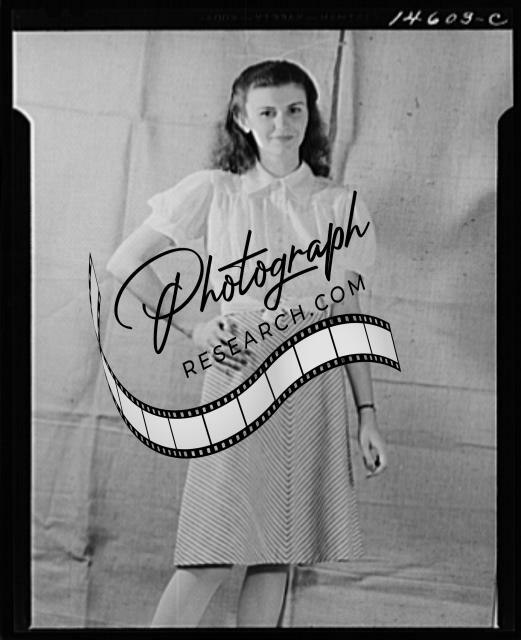 Title: Washington, D.C. Modeling blue dress made from sugar sacks worked out for a high school girl on a low income by graduate students of the Deptartment of Clothing and Textiles, School of Home Economics, University of Alabama. Total cost of materials was three dollars and eighteen cents