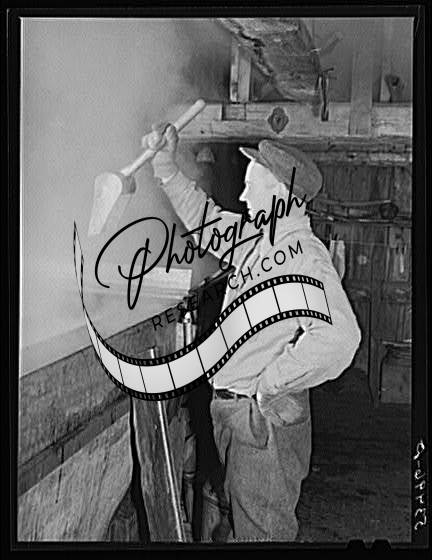 Title: Walter N. Gaylord dripping the boiled-down maple syrup sap to see if it has reached correct consistency for syrup. Making maple syrup on King evaporator. Waitsfield, Mad River Valley, Vermont. He averages about 150 gallons of syrup annually, this year he tapped 600 out of his 1000 trees because of an unusually deep snow and late spring. He owns several farms in this particular farm unit. There are eighty acres. It has been in family three generations. Has about thirty-five or forty heads of cattle, raises poultry and potatoes