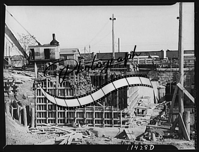 Title: Washington, D.C. Construction of a bridge and road near Independence Avenue and 14th and 16th Streets, S.W. Concrete work with steel reinforcing rods in front of partly-finished forms