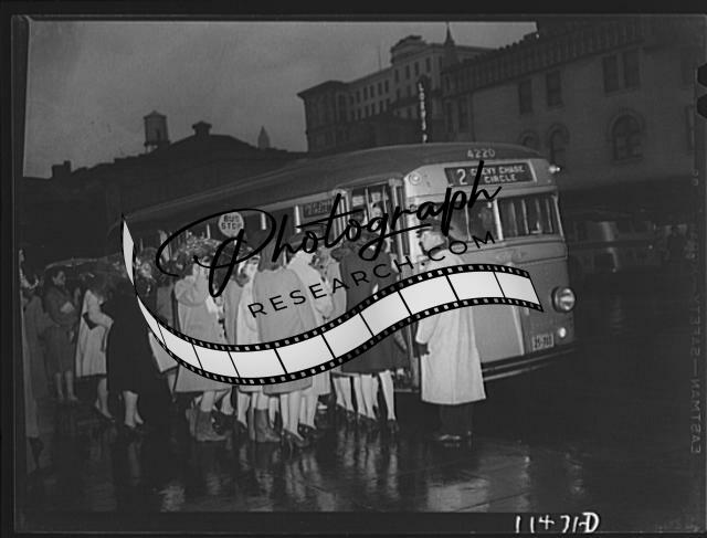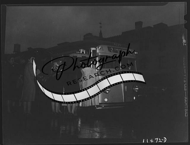 Title: Washington, D.C. People boarding a bus on 13th Street on a rainy night