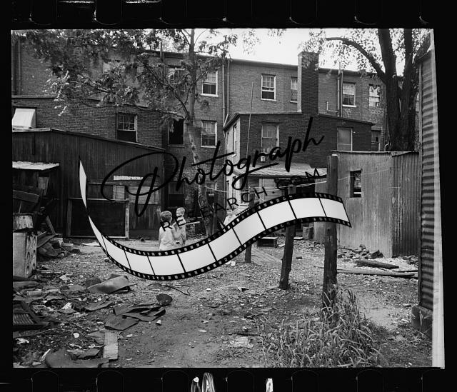 Title: Children playing in backyard in slum area near capitol. This area inhabited by both white and Negro, Washington, D.C.