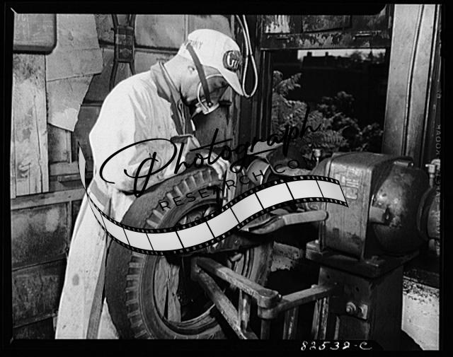 Title: Washington, D.C. Washington tire store. Bending out walls of a tire to inspect it before retreading