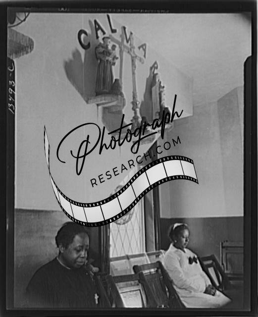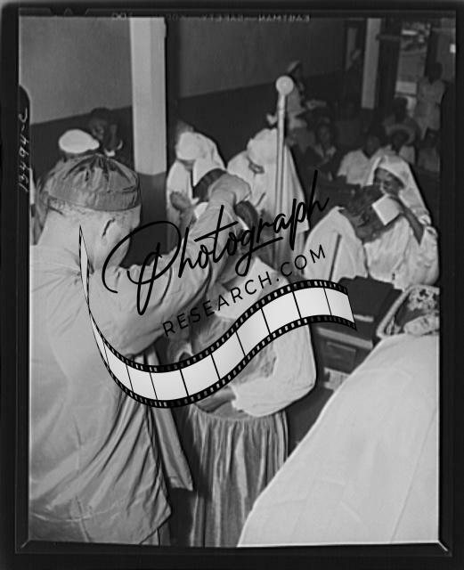 Title: Washington, D.C. Mrs. Ella Watson, a government charwoman, receiving annointment from Reverend Clara Smith during the 'flower bowl demonstration,' a service held once a year at the St. Martin's Spiritual Church. Reverend Vondell Gassaway is the pastor