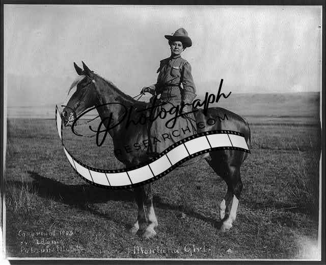 Montana girl,Woman in cowgirl attire on horseback,c1909