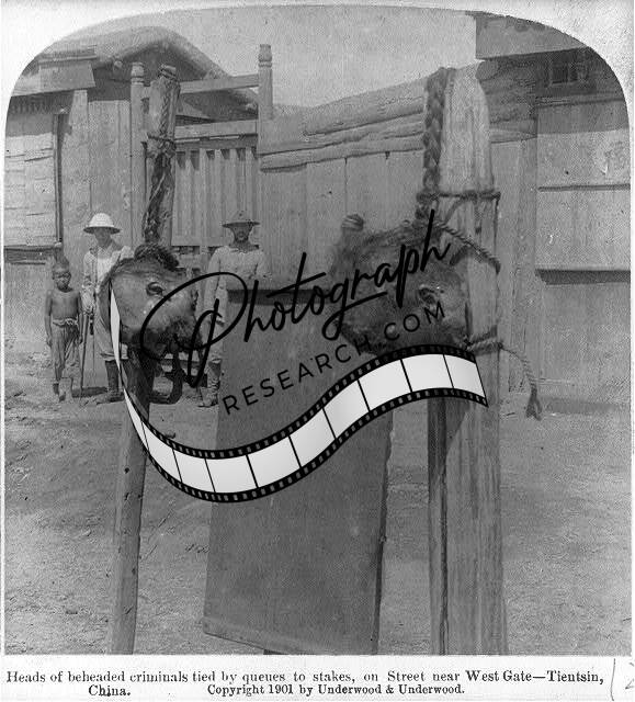 Heads of beheaded criminals tied by queues to stakes, on Street near West Gate - Tientsin, China